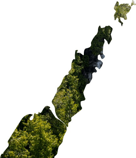 An aerial photo of trees cut in the shape of the Door County peninsula
