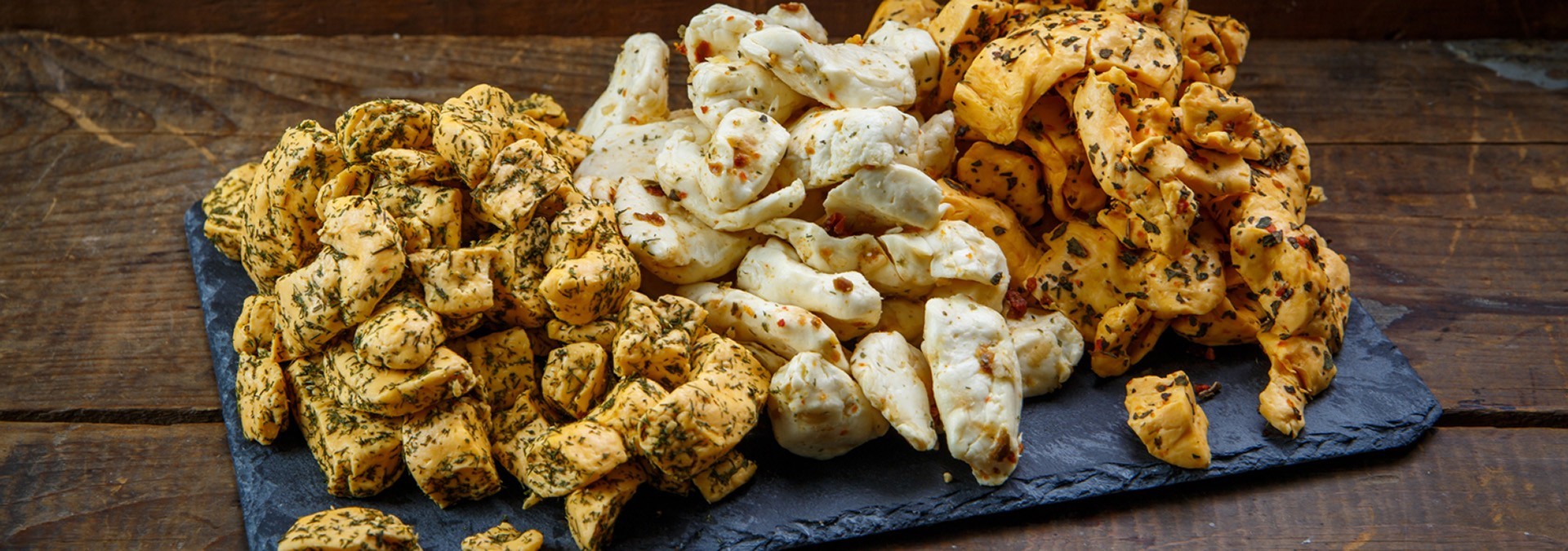 One of the other top-selling varieties includes the Terrific Trio cheese. It’s a blend of Cheddar, Parmesan, and Gouda, with a slightly crumbly texture and salty, savory flavor—ideal for grating over pasta and salads or savoring by itself.